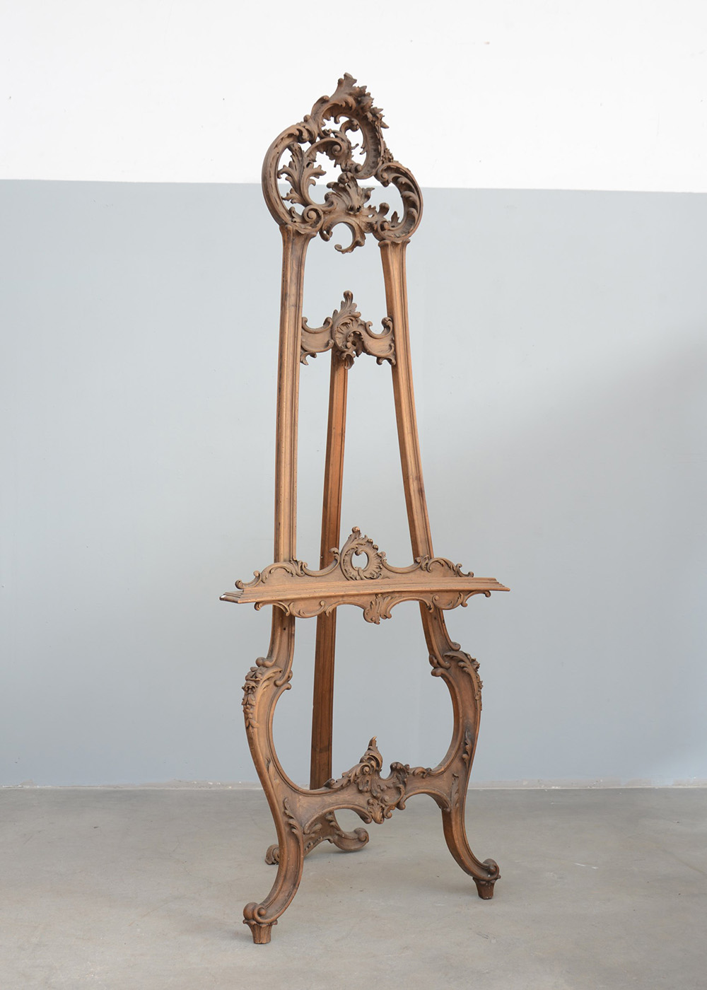 Antico cavalletto tripode per dipinti in legno intagliato (h cm 218) (difetti e mancanze)
