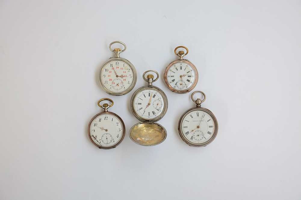 Lotto composto da cinque orologi da tasca in materiali ed epoche diverse (difetti)