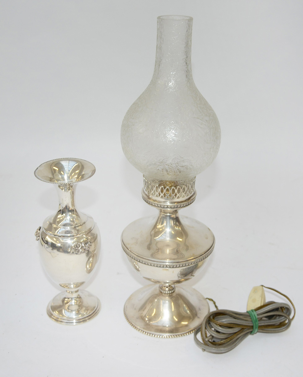 Lotto composto da una lampada in argento e vetro e un'anfora in argento....