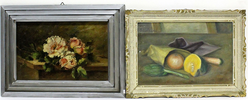 Lotto composto da un dipinto ad olio raffigurante rose ed un pastello raffigurante una natura morta con ortaggi, autori e misure differenti. In cornici (difetti)