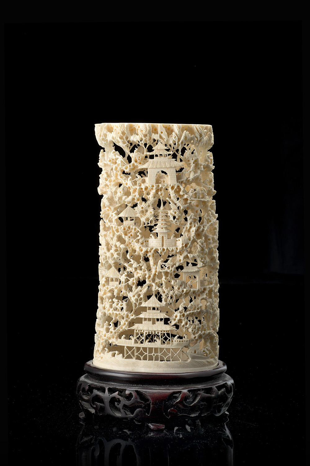Portapennelli in avorio scolpito e cesellato con paesaggio, con base in legno
