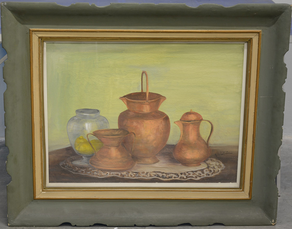 "Natura morta con rami" olio su cartone pressato (cm 62x87) firmato in basso a destra, in cornice (difetti)