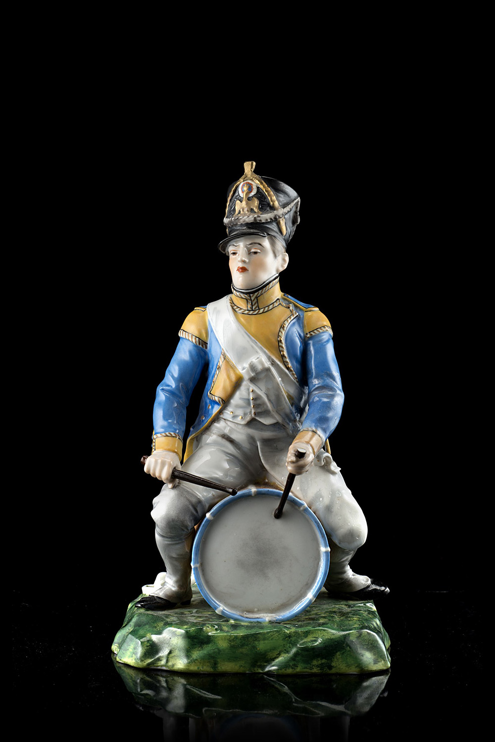 Manifattura del sec. XX "Suonatore di tamburo del quarantaduesimo reggimento di fanteria" statuetta in porcellana policroma (h. cm 22) Inscritta alla base (mancanze)