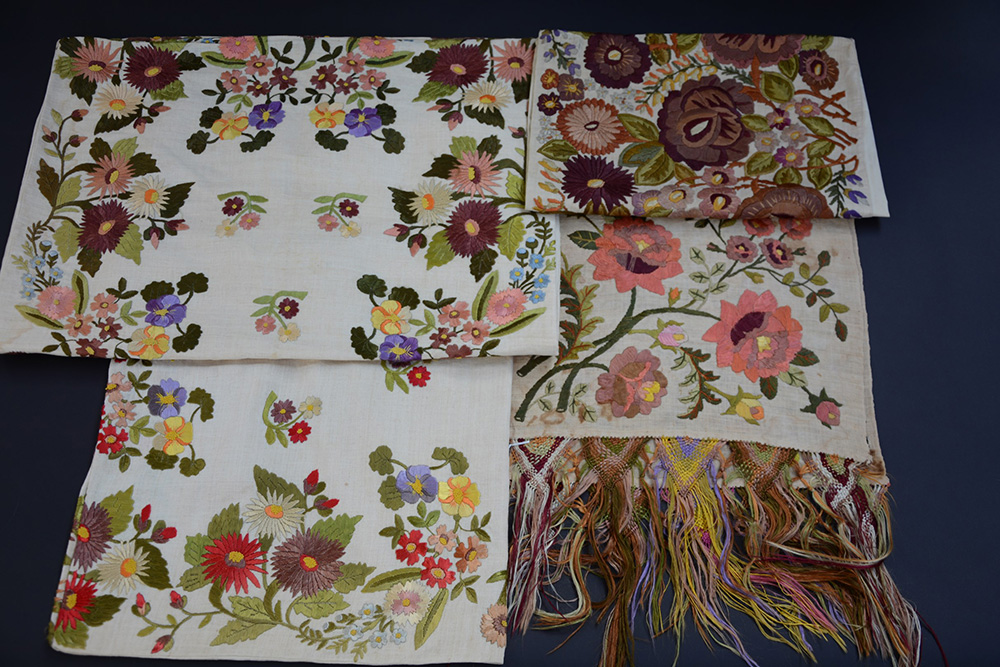 [Tappeti] Lotto composto da tre copricuscini di varie misure in cotone misto lino ricamati in seta policroma con decoro floreale in stile tirolese, unito ad una striscia di ugual fattura con frange (90x65 cm) (difetti)