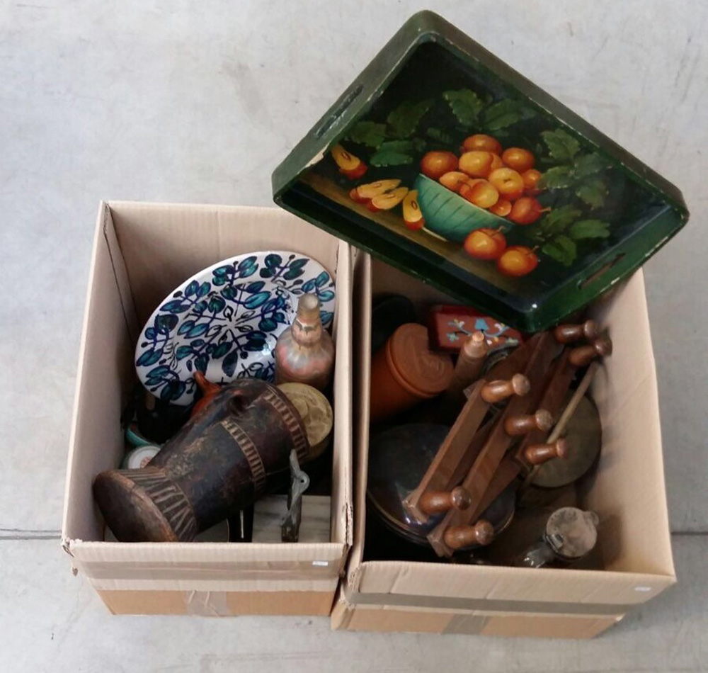 Lotto di due cartoni contenenti numerosi oggetti di uso e materiali differenti (difetti)