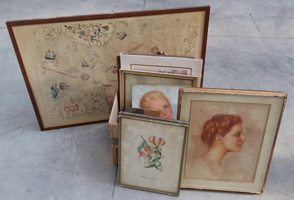 Cartone contenente alcuni quadri di soggetto, tecnica e autori differenti, cui si unisce una specchiera ovale e una grande riproduzione a colori raffigurante un’antica mappa (difetti)