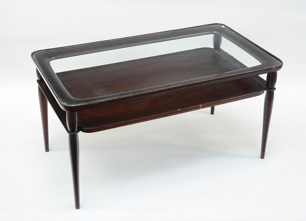 Tavolino da salotto a due ripiani in legno e vetro, anni '50 (difetti)