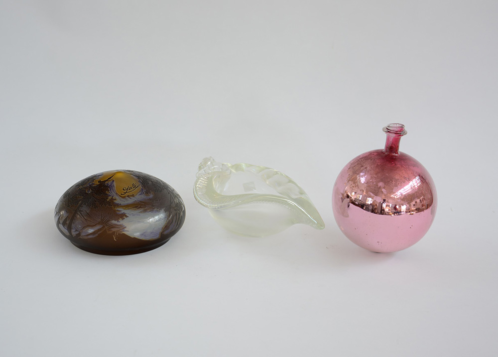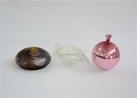 Lotto composto da una conchiglia di vetro, un cappello per lampada marcato Gallé e un puntale in vetro rosa (misure diverse) (gravi difetti)