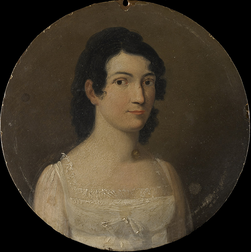 School of the 19th century "Portrait of a Lady in a White Dress" oil on copper (d. cm 17) Framed (defects)