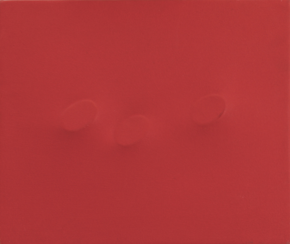 TURI SIMETI Alcamo 05/08/1929 Senza titolo, 2002 tela rossa estroflessa cm. 30x35, firma e anno al retro, dichiarazione d'autenticità dell'artista su foto.