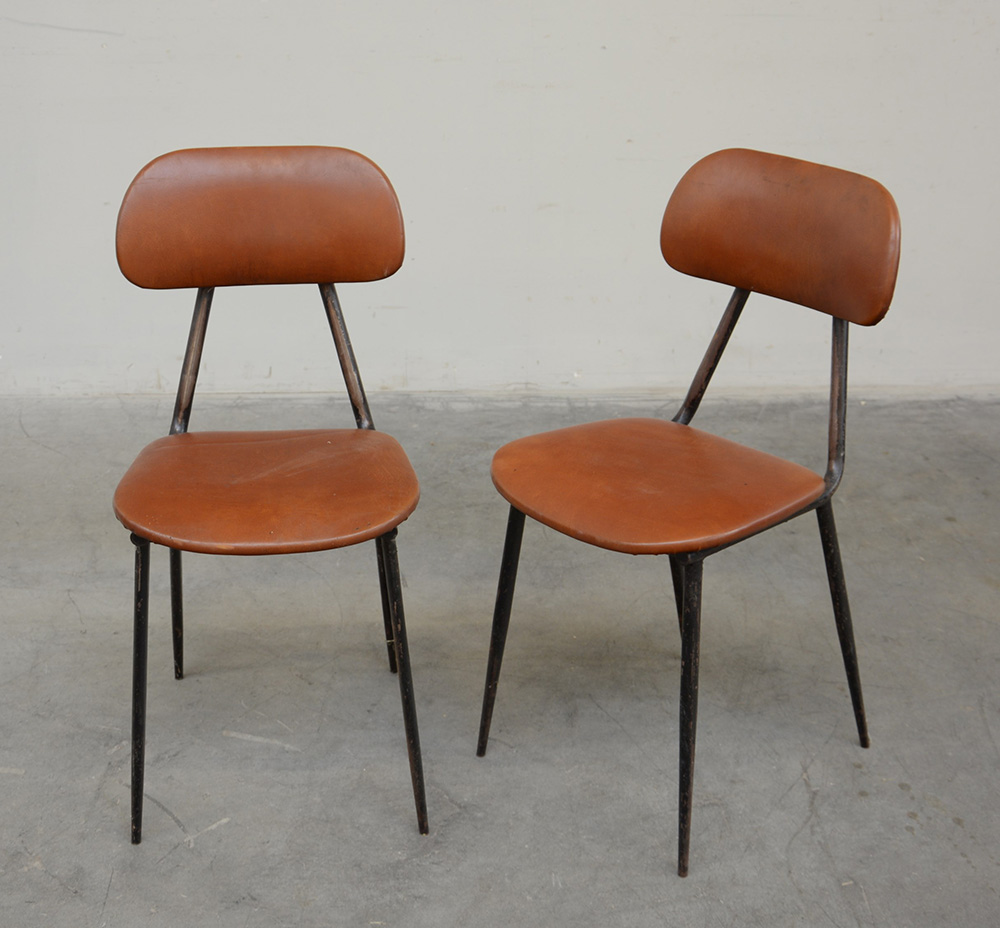 Coppia di sedie con struttura in metallo verniciato nero, seduta e schienale in similpelle. Sec.XX (difetti)