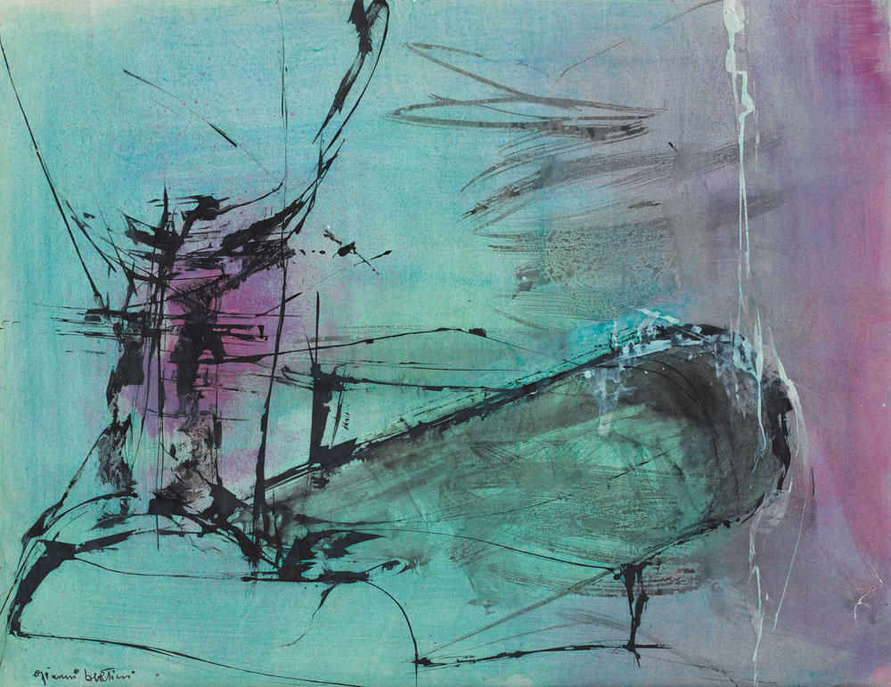 GIANNI BERTINI Pisa 31/07/1922 - Caen (Normandia) 08/07/2010 Un genre disparu, 1955 tecnica mista su carta cm. 50x64, firma in basso a sinistra, titolo e firma al retro, opera registrata presso la Fondazione Gianni Bertini a cura del figlio Tierry come da dichiarazione su foto.