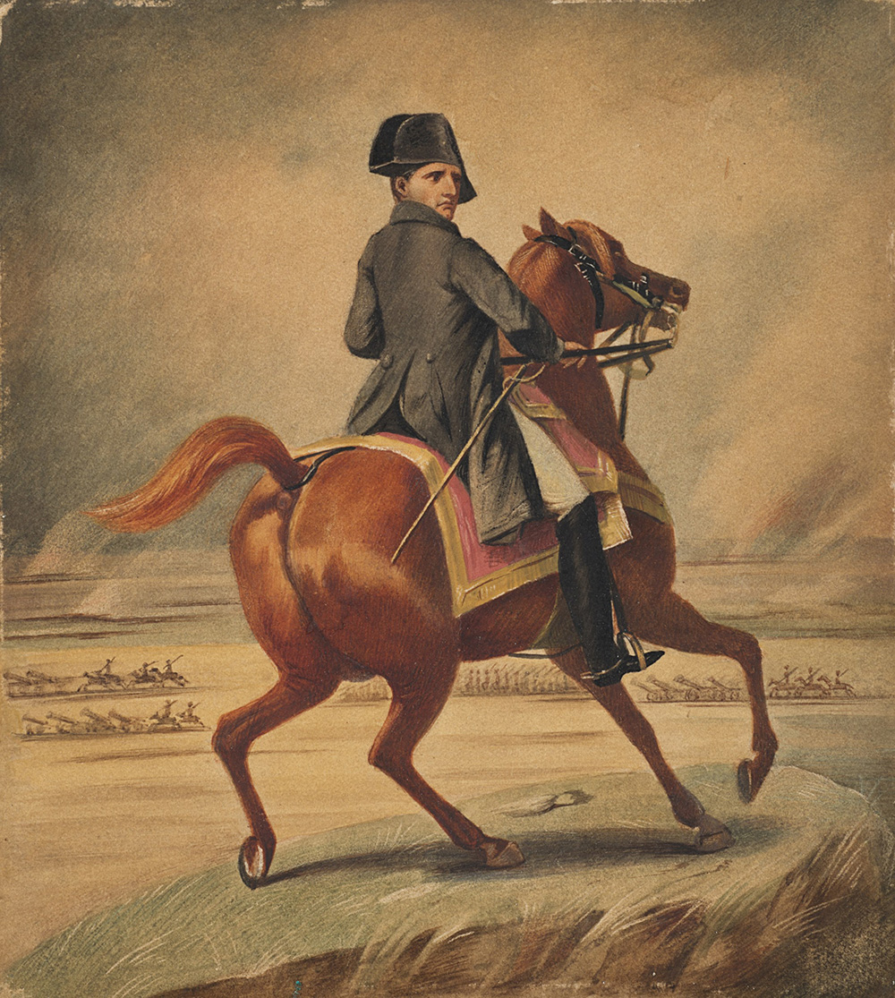 School of the 19th century "Portrait of Napoleon on Horseback" watercolour on paper applied to pressed cardboard (cm 14.5x12) Framed (defects)