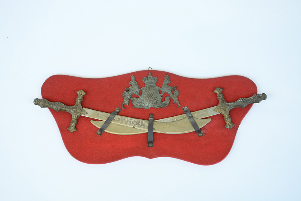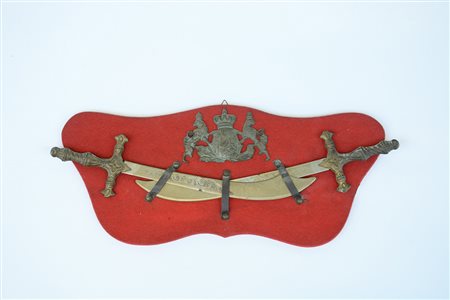 Panoplia con armi orientali in miniatura di produzione moderna unite ad uno stemma in bronzo di fine secolo XIX (l. cm 37) su supporto in tessuto rosso (difetti)