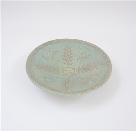 Manifattura di Elchinger. Alzata in terracotta smaltata decorata a rilievo da animali fantastici e volute. Sec XX (d cm 43) (lievi difetti)