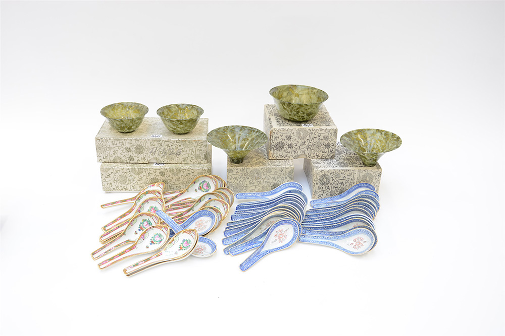 Lotto composto da nove ciotole in giada, alcune con scatole e quarantanove cucchiaini in porcellana