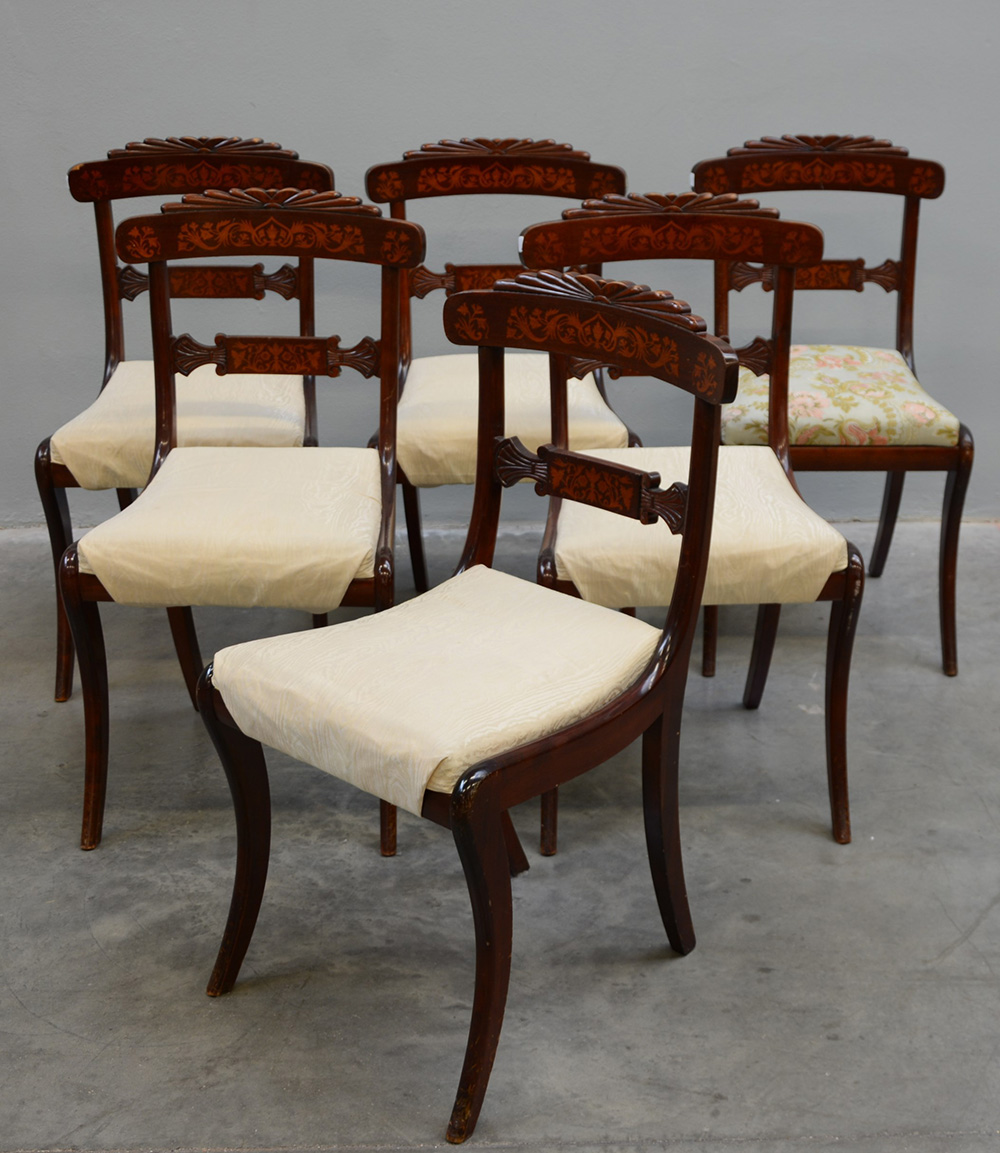 Gruppo di sei sedie in mogano intarsiate a motivi vegetali con schienale a...