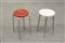 Due sgabellini con gambe in metallo cromato, sedute in similpelle rosse e bianche. Italia anni 70 (difetti)