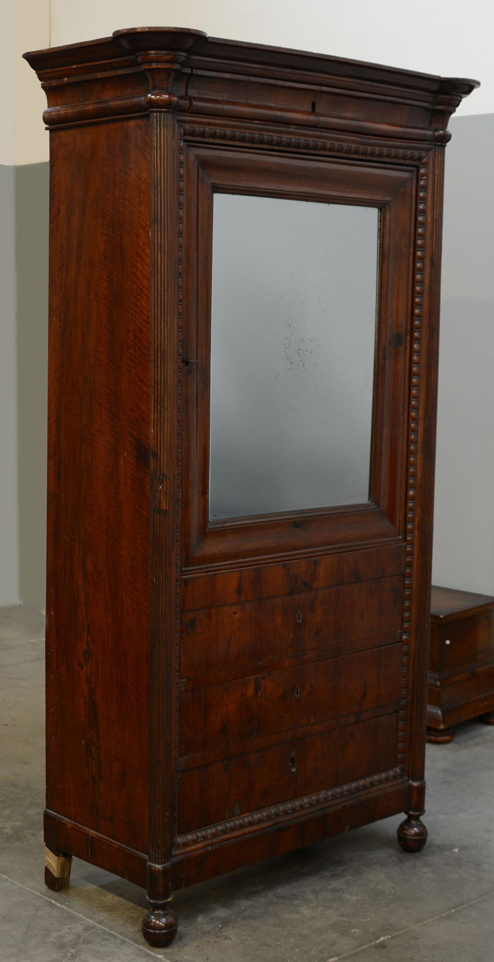 Armadio lastronato in noce e piuma di noce con fronte ad un'anta a specchio, tre cassetti grandi nella base e mezzo cassetto nella fascia superiore. Montanti a colonna scanalata e piedini torniti. Sec. XIX (cm 110x198x52)(difetti)