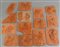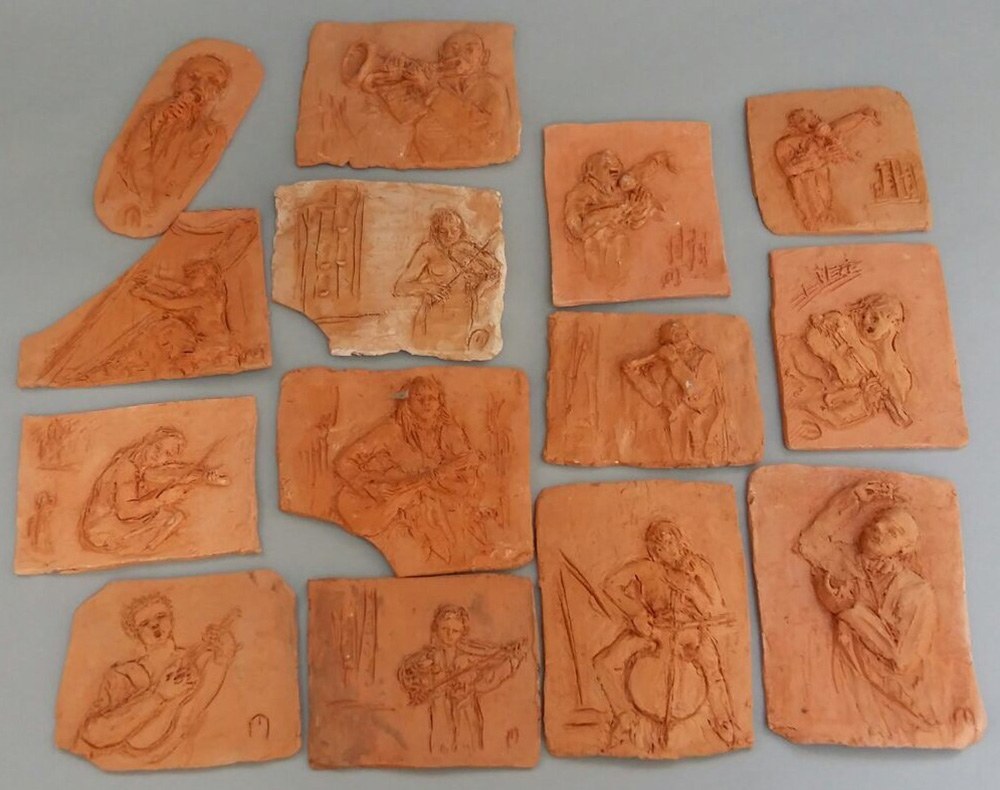 Cartone contenente numerose placche in terracotta raffiguranti musicisti e cantanti, dimensioni differenti (difetti e mancanze)