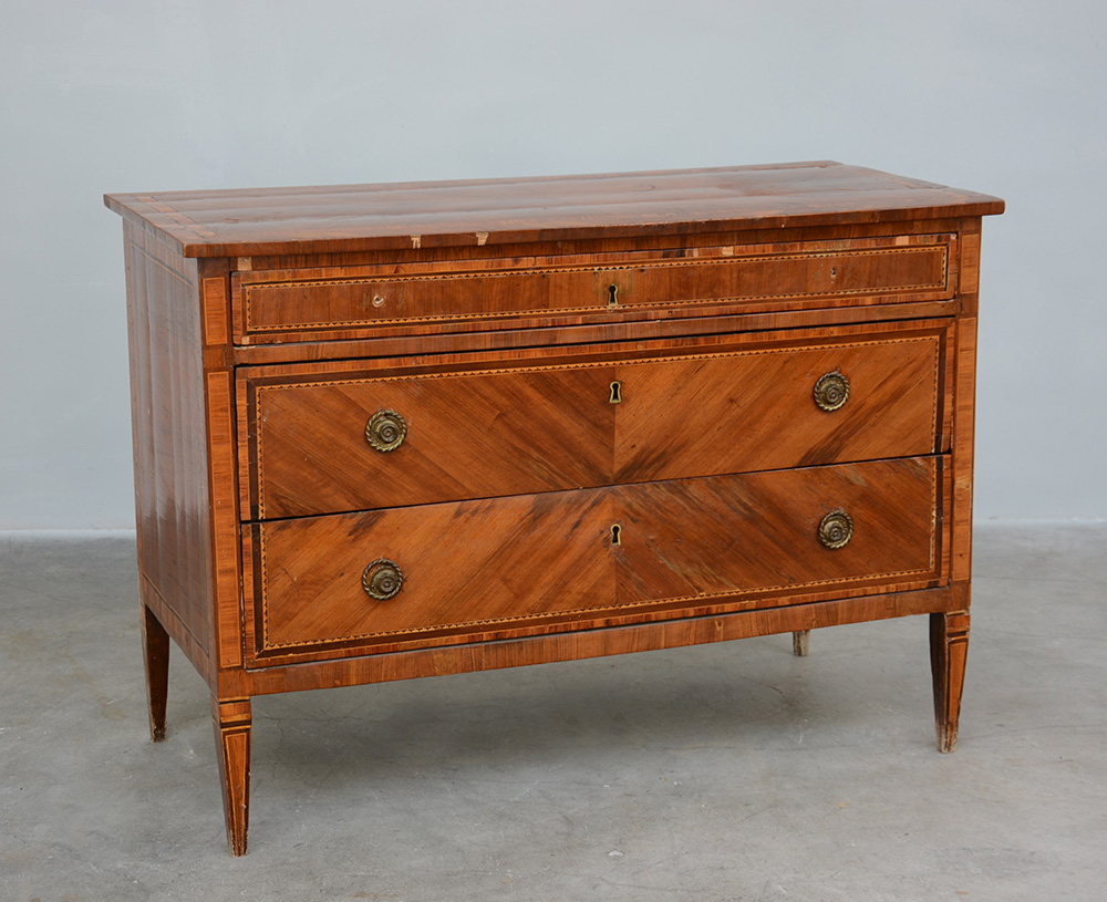 Comò' lastronato in noce e filettato in legni vari con fronte a due cassetti e mezzo. Gambe rastremate. Sec. XVIII (cm 120x86x55) (restauri e mancanze)