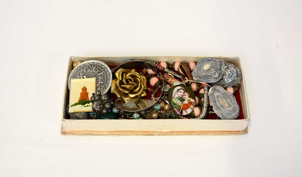 Scatola contenente oggetti di varie dimensioni ed usi compresa bigiotteria (difetti e mancanze)