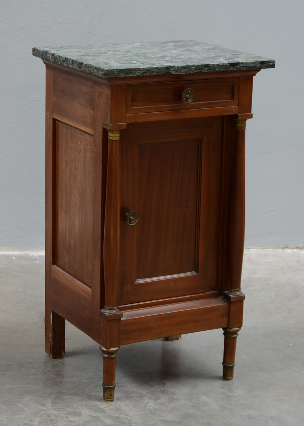 Comodino ad un anta ed un cassetto riquadrati, montanti a colonna tornita, piano in marmo verde (cm 47x84x40)(difetti)