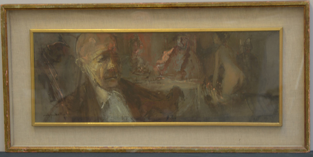 "Scena d'interno con figure" Olio su tela (cm 30x80) firmato in basso a sinistra, in cornice