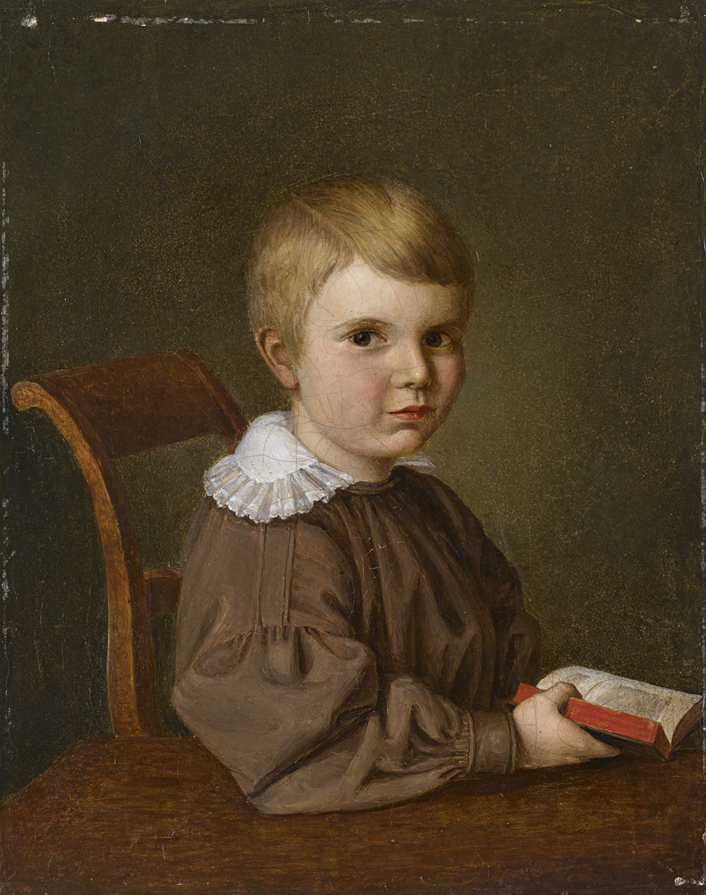 Scuola del sec. XIX "Ritratto di fanciullo con libro" olio su tela (cm 28x23) In cornice in legno e pastiglia dorata (difetti)