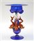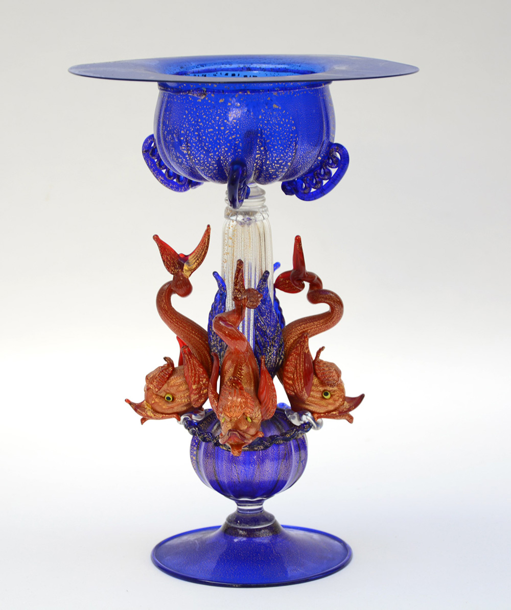 Manifattura di Murano del secolo XX grande coppa in vetro soffiato blu, trasparente e rosso con inclusioni di foglia d'oro e applicazioni in pasta di vetro, gambo decorato da delfini a tutto tondo (h cm 28)