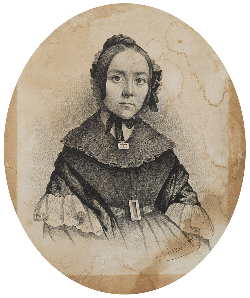 Litografia raffigurante giovane donna con cuffia, in ovale. In cornice in...