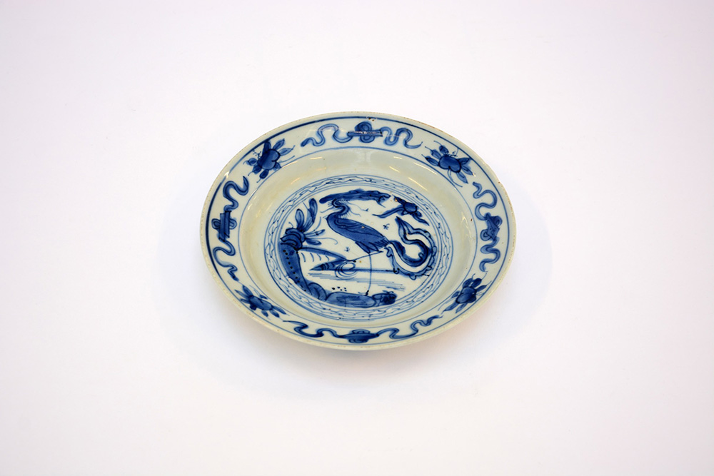 Piatto in ceramica con decorazioni blu, marchio sul fondo (difetti)