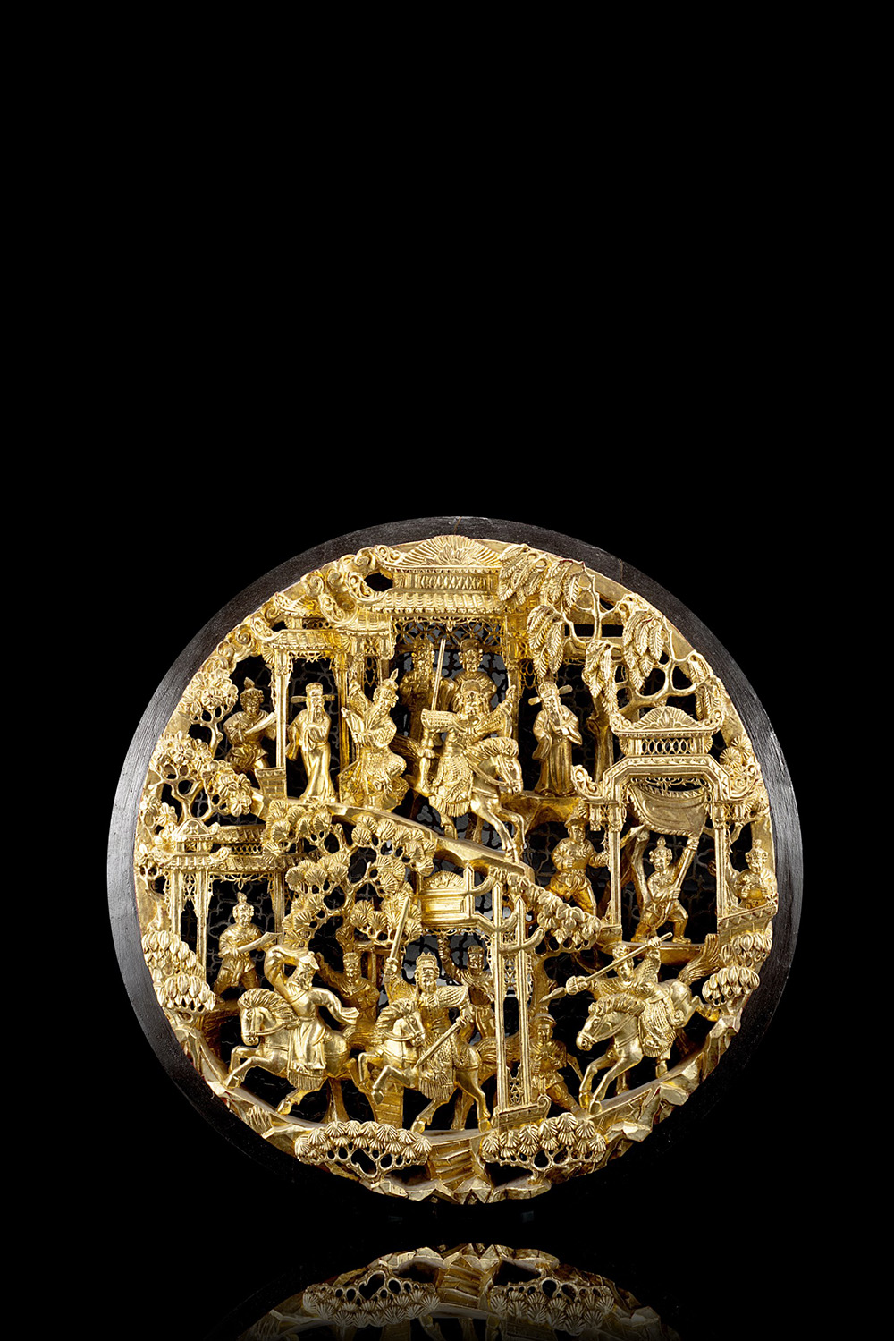 Parte di fregio architettonico in legno scolpito e dorato, decorato con scene di battaglia. Cina, sec. XX (diam. cm 49)(lievi difetti)