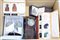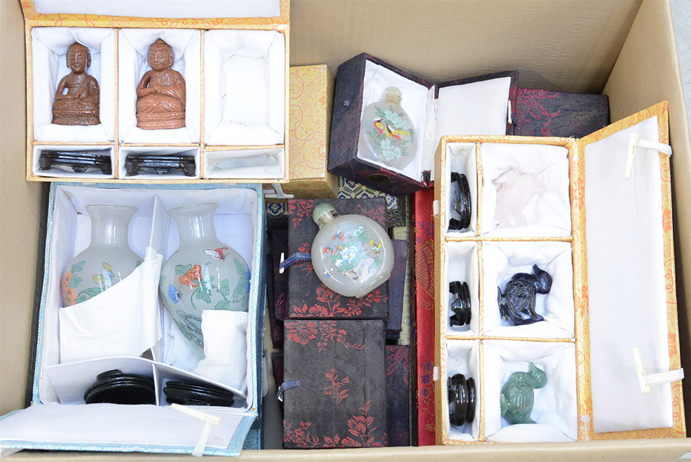 Una scatola contenente sei teste di cane, tre papere, sei leoni, dieci gufi, due buddha, dodici animaletti, dieci snuff bottle, quattro vasetti di materiali e misure diverse, con scatole
