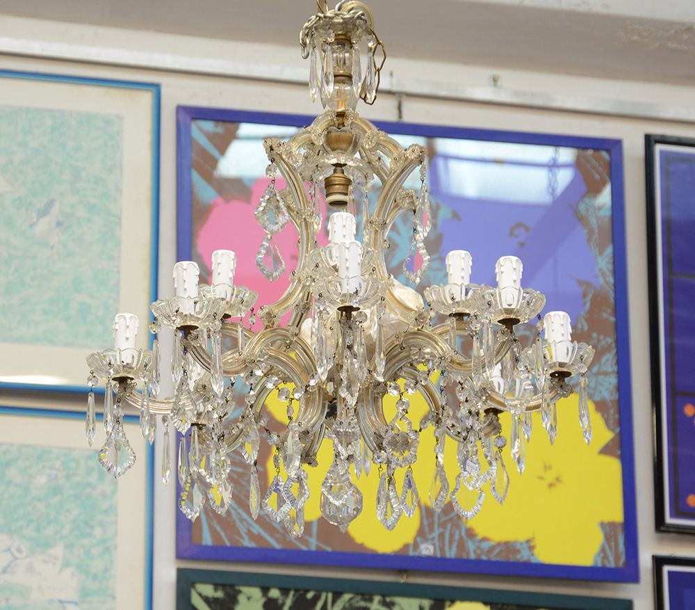 Lampadario a dodici fiamme in metallo e vetro incolore (difetti)