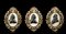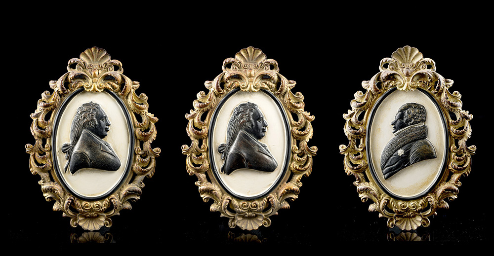 Tre profili di gentiluomini applicati su ceramica (cm 20x15) In cornici traforate e dorate (difetti)