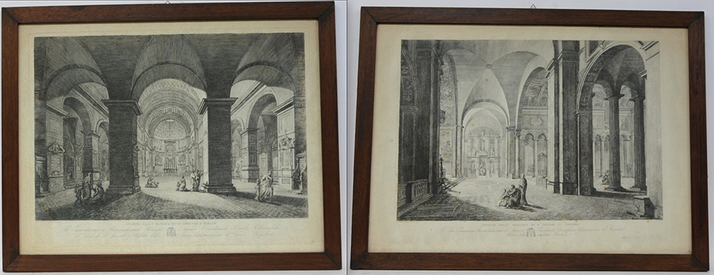 Lotto composto da due incisioni raffiguranti l'interno della Basilica dei SS. Lorenzo e Damaso e la Basilica di S. pietro in Vincoli. In cornici (difetti).