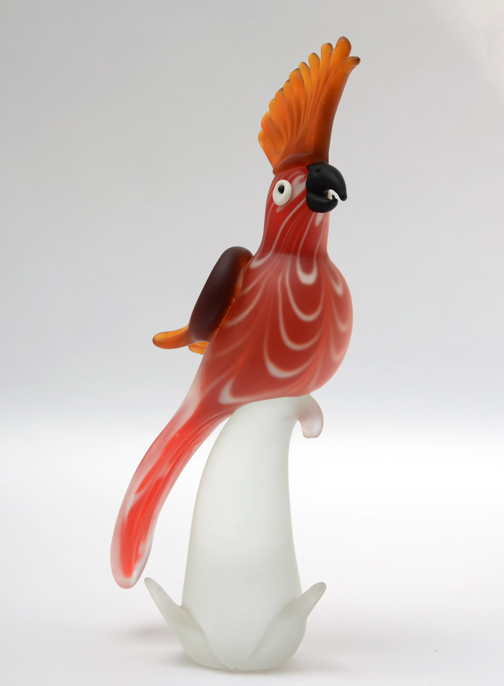 L. Zanetti, Murano. "Pappagallo" scultura in vetro sommerso policromo con applicazionpasta di verto (h cm 37) firma incisa sotto la base.