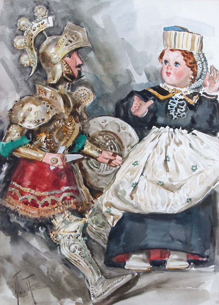 ALDO RAIMONDI Roma 1902 - 22/07/1998 Marionette acquerello su carta applicata su cartone cm. 77x56, firma in basso a sinistra.