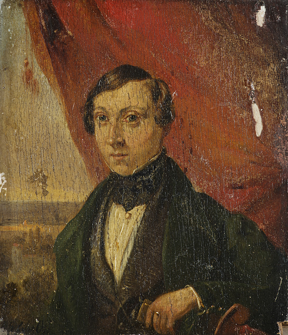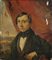 School of the 19th century "Portrait of a Gentleman in a Landscape" oil on board (cm 12x10.5) Undeciphered signature and date to the bottom left. Framed (defects)