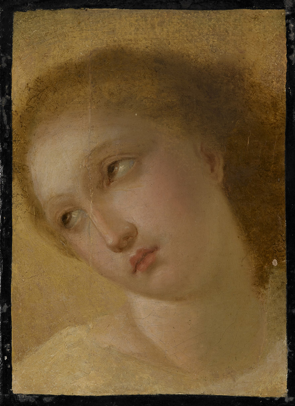 School of the late 19th century "A Girl" fragment" oil on canvas (cm18x13) Framed. Stamp to reverse Collezione Luisa Feltrinelli (defects)