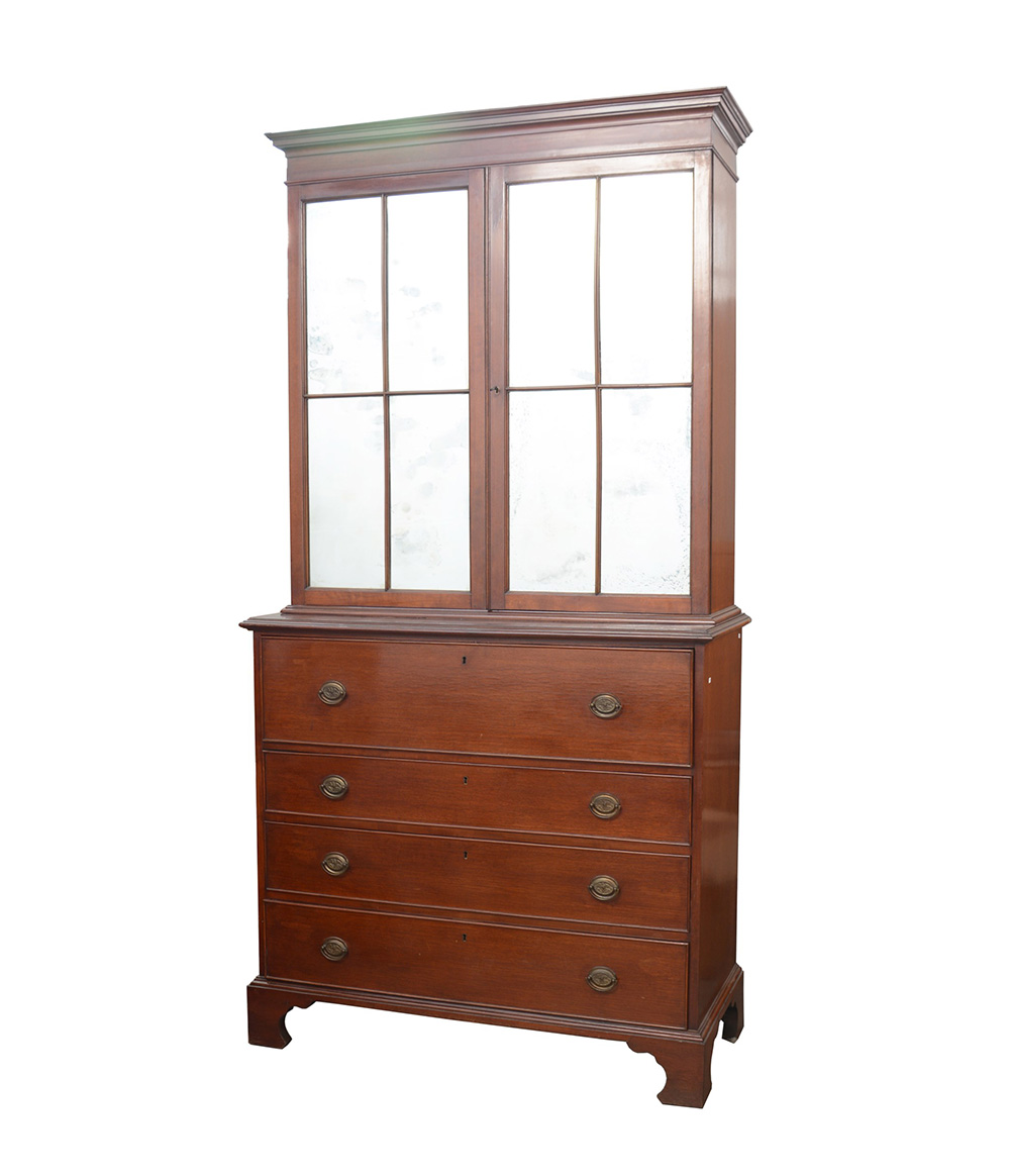 Mobile a due corpi in mogano. Parte superiore a due ante a specchio riquadrate da listelli, parte inferiore ad un cassetto sottopiano apribile celante all'interno cassettini e vani e tre cassetti grandi sul fronte. Piedi a mensola. Inghilterra, fine sec. XIX (cm 113x220x51)