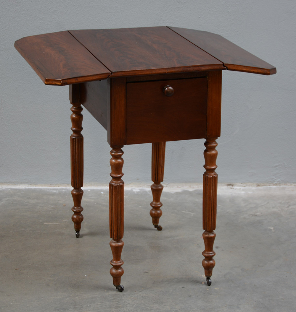 Tavolino ad alette a due cassetti e antina contrapposta, gambe tornite e...