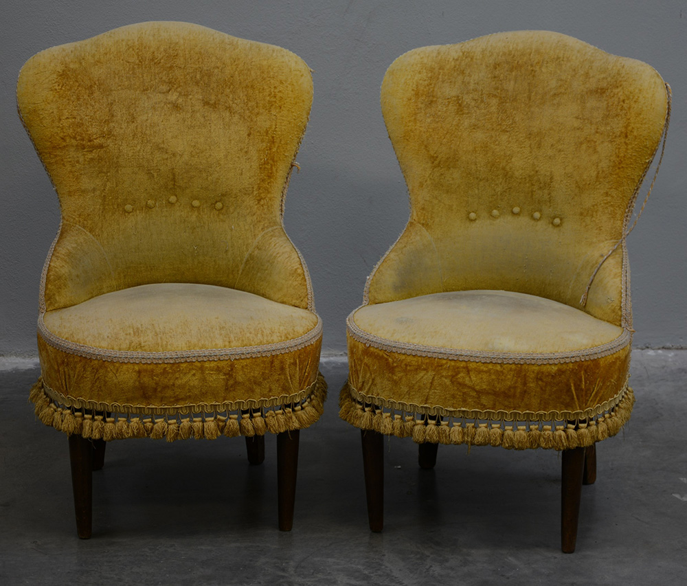 Coppia di poltroncine da camera con piedi anteriori torniti rivestite in velluto ocra, fine sec XIX (difetti)