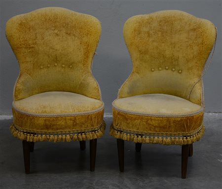 Coppia di poltroncine da camera con piedi anteriori torniti rivestite in...