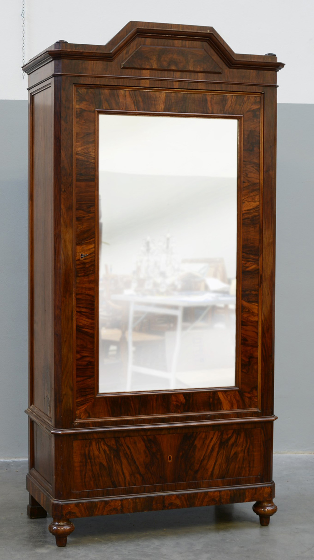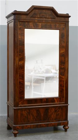 Armadio ad un'anta a specchio lastronato in noce e radica di noce, cassetto alla base, cimasa sagomata, piedi torniti. Fine sec. XIX (cm 108x220x55)(difetti e mancanze)