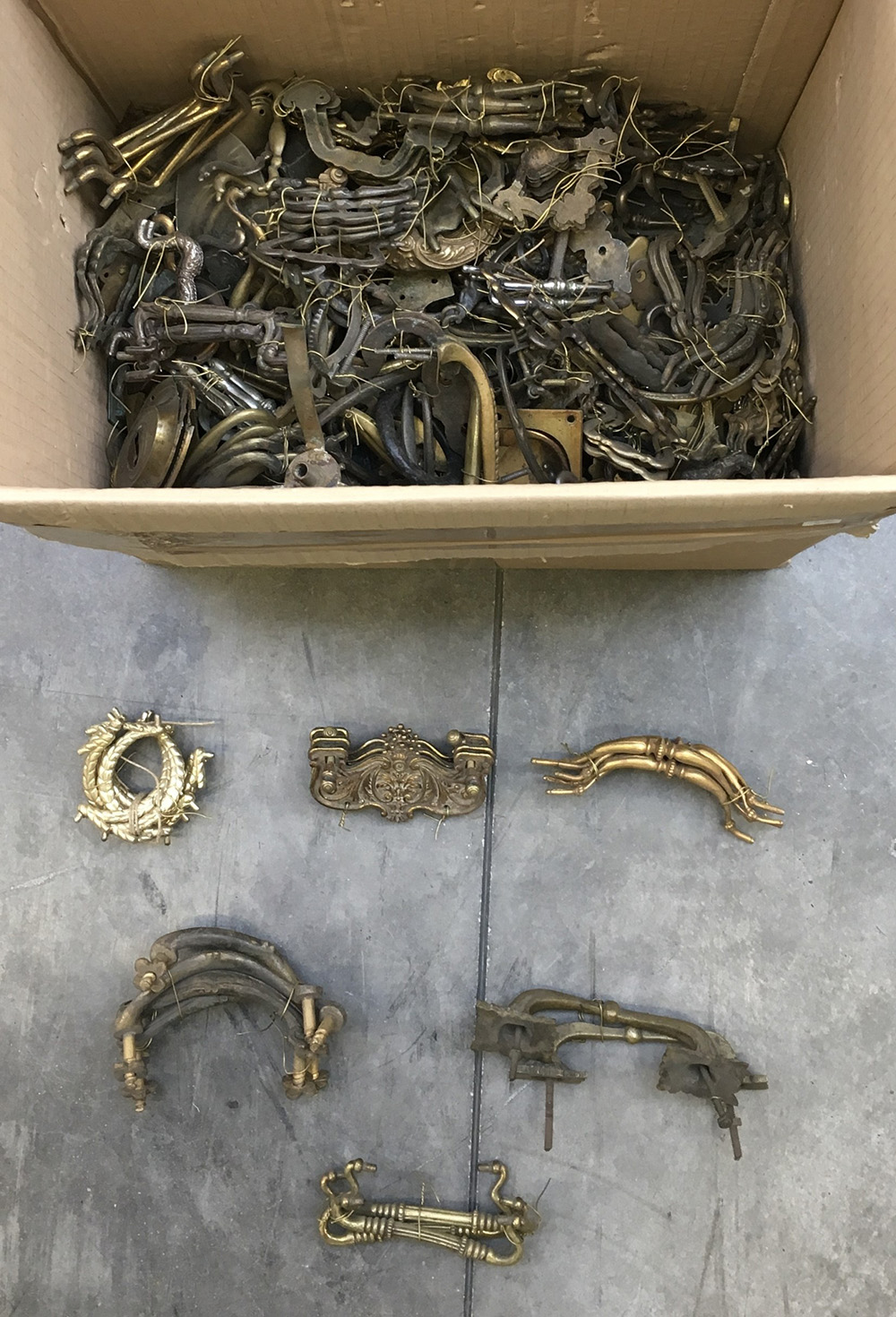 Cartone contenente numerose maniglie in metallo di fatture ed epoche differenti (difetti)