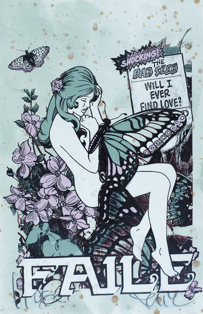 FAILE (gruppo: Patrick McNei e Patrick Miller) 1999 Butterfly girl II serigrafia ritoccata a mano con acrilico bianco, grigio e rosa su carta tessuto cm. 96,5x62,5; (esemplare unico), firma in basso a destra, già Bloombsbury Auction (London) 2 luglio 2008.