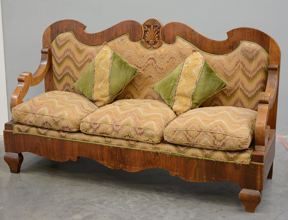 Divano a tre posti con schienale sagomato e intagliato al centro da conchiglia stilizzata fine sec XIX (difetti)