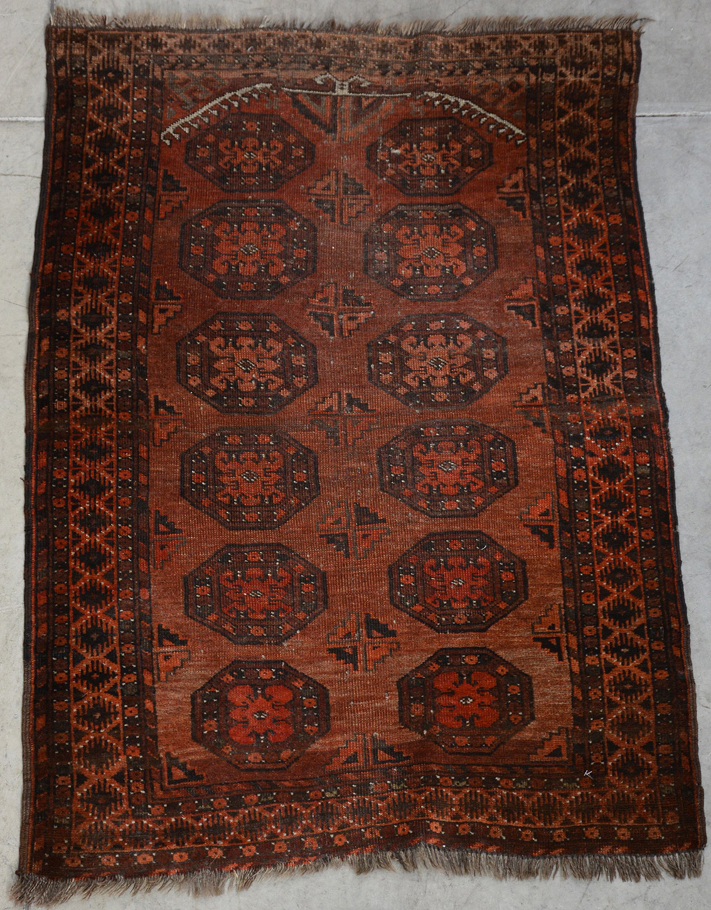 Tappeto preghiera con disegno a Gul nei toni dell'arancio, marrone e rosso. (cm 130x89) (difetti)